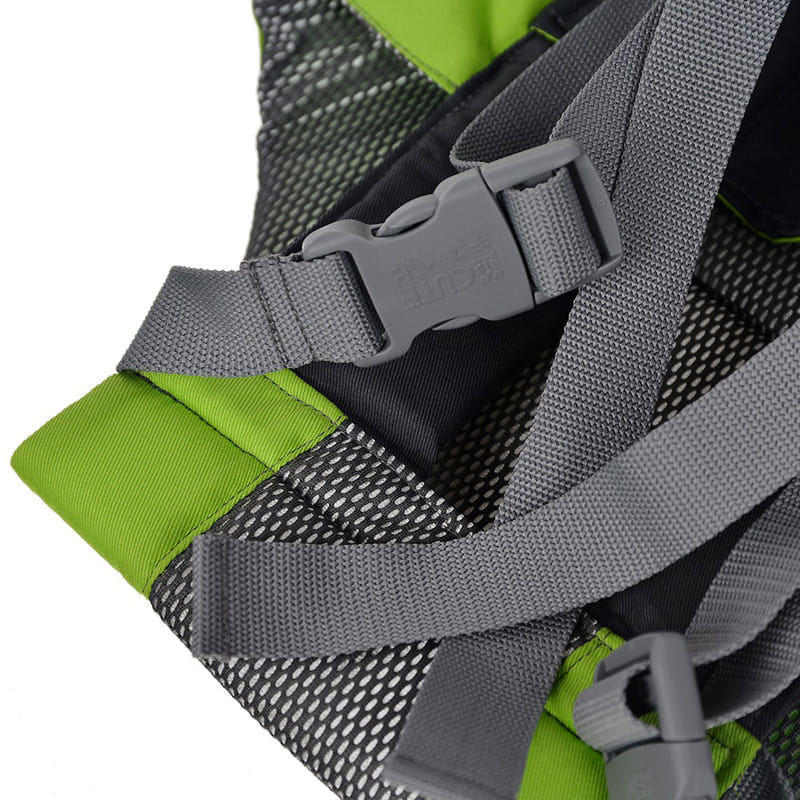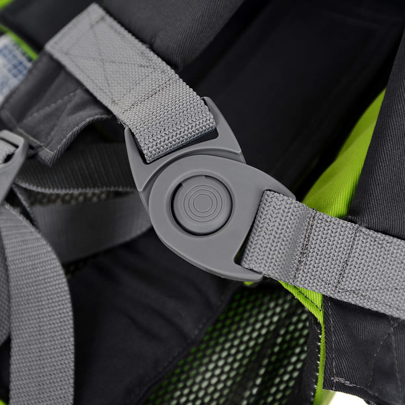 Người sử dụng mặc địu vào người và cài, điều chỉnh móc khóa an toàn bốn hướng.