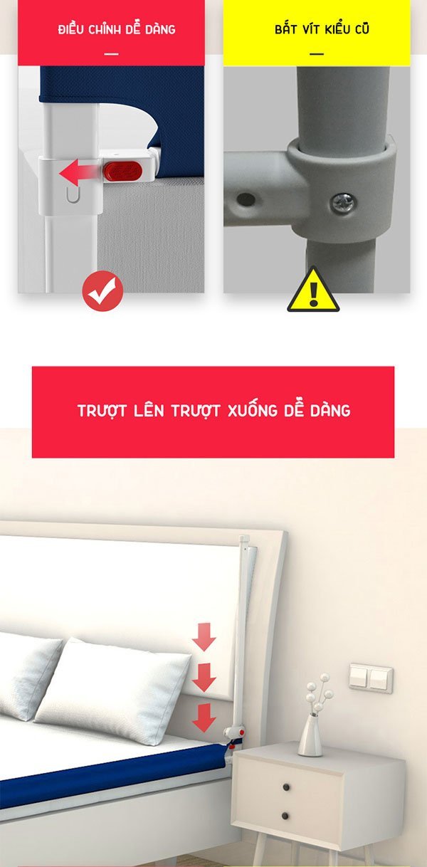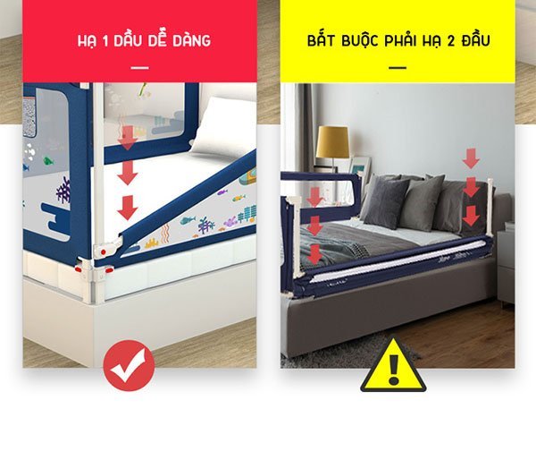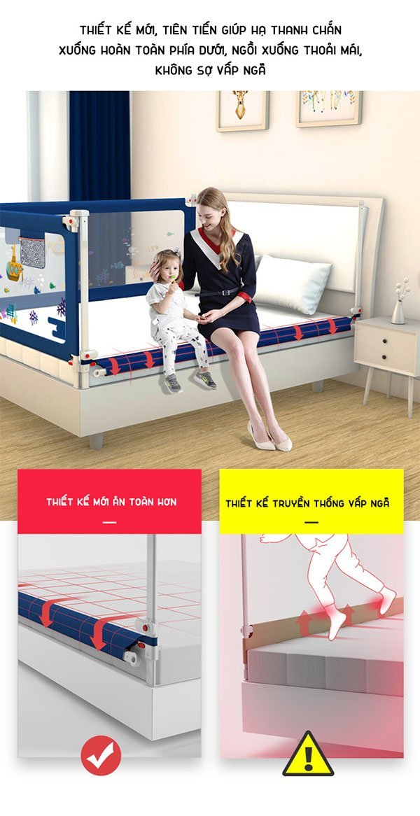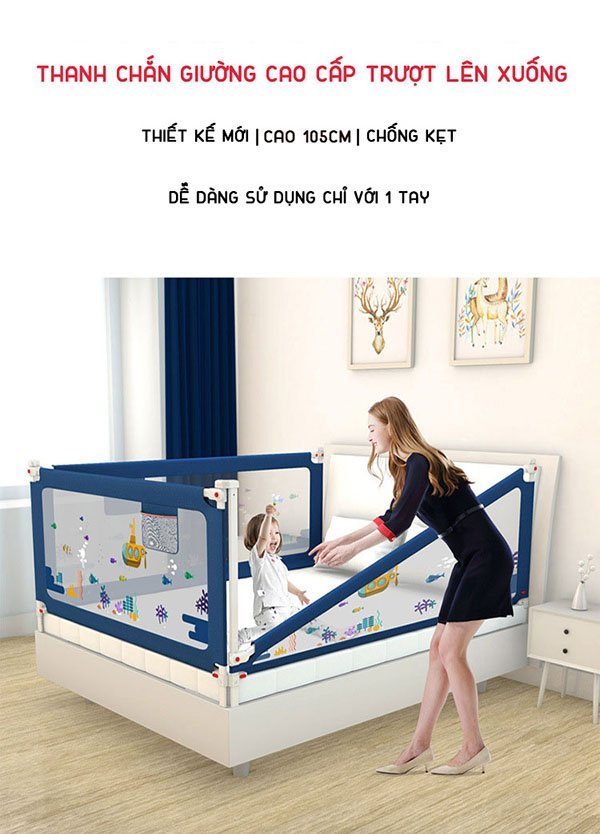 Thanh chắn giường Playkids dài 1.6m – 2.2m cao 105cm chống kẹt, 24 nắc điều chỉnh trượt lên xuống mẫu mới nhất có thể hạ xuống 1 đầu dễ dàng, hạ xuống hoàn toàn không nhô lên chống vấp ngã.