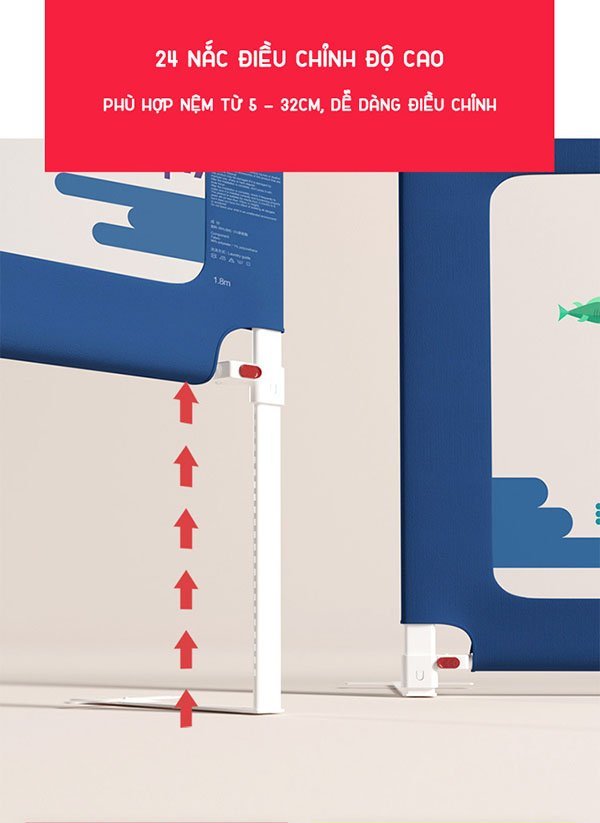 Độ cao của chân thanh chắn tùy chỉnh 24 mức: từ 75cm đến 103cm thích hợp với mọi loại đệm dày hay mỏng từ 5cm – 32cm.