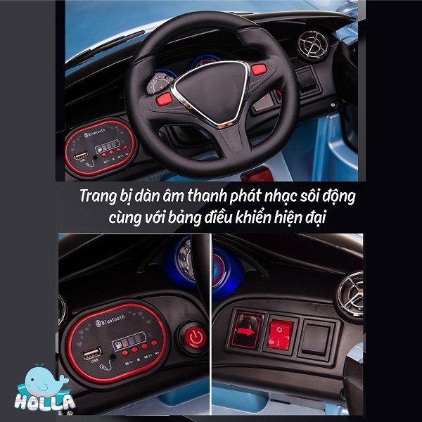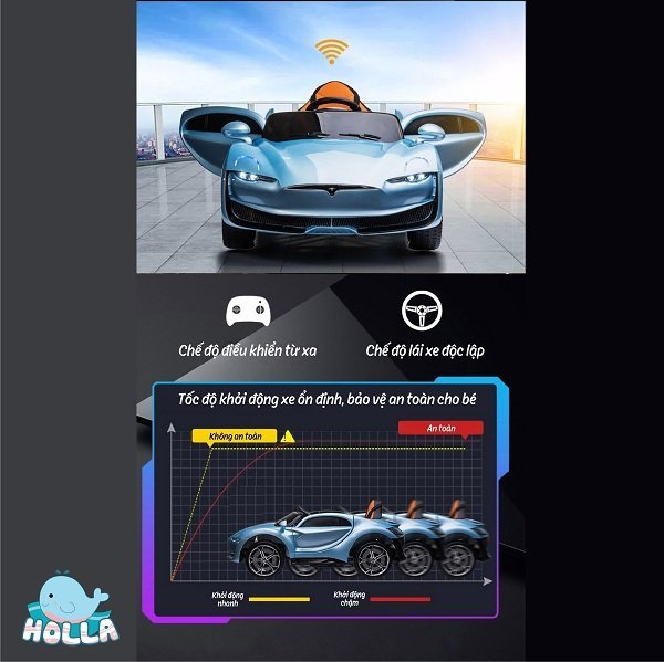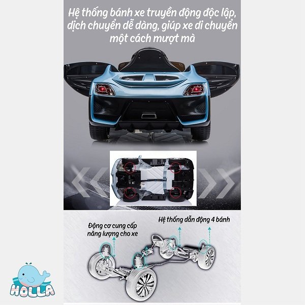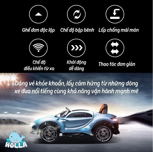 Xe ô tô điện Holla với dáng vẻ khỏe khoắn lấy cảm hứng từ những dòng xe đua nổi tiếng cùng khả năng vận hàng mạnh mẽ. Đảm bảo bé nhà bạn vô cùng thích thú với chiếc xe hơi điện Holla này.