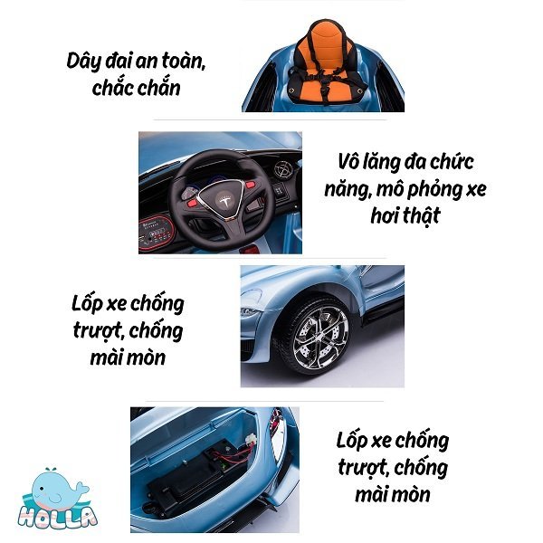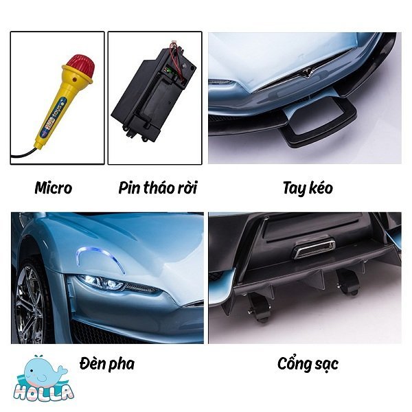 Xe hơi điện Holla còn có Cổng sạc, Đèn pha, tay kéo, pin có thể tháo rời, Mico.